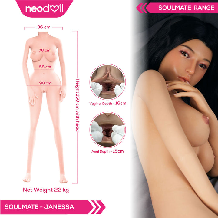 Janessa aus der Soulmate-Serie ist eine atemberaubende Vollsilikon-Sexpuppe für alle, die Schönheit und Realismus gleichermaßen schätzen. Mit ihrer makellosen Silikonhaut und lebensechten Gesichtszügen, einschließlich implantiertem Haar, bietet Janessa ein wahrhaft intensives Erlebnis. Ihr eleganter, kurvenreicher Körper, die Gelbrüste und die strukturierten Vaginal- und Analkanäle sorgen für intensive Stimulation, während ihr Schulterskelett realistische Schulterbewegungen ermöglicht und so die Bewegungen einer echten Frau nachahmt.